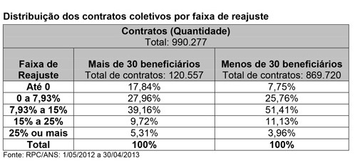 Embora a informação não esteja devidamente demonstrada, aproximadamente 50% do total de contratos coletivos tiveram reajuste maior a 7,93% (índice fixado pela ANS para o reajuste dos contratos individuais). A situação dos contratos de até 30 vidas é ainda mais preocupante, pois 66% destes tiveram reajustes maiores que o índice fixado pela ANS para os planos individuais/familiares e da própria média dos reajustes dos contratos coletivos como um todo.